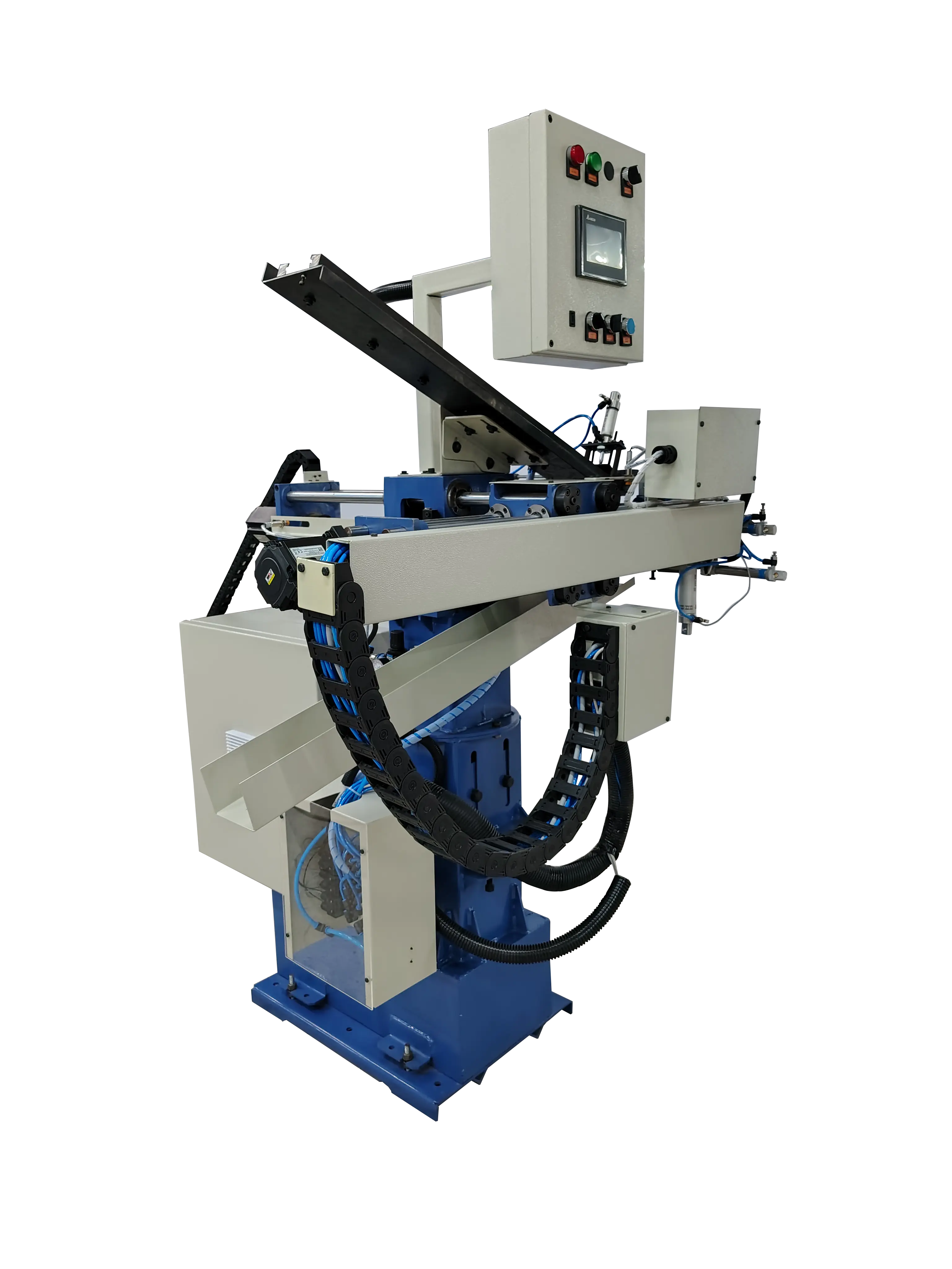 Our 2-Axis automated loader system are designed to load unload parts in CNC Turning Lathes. Constructed with LM Shafts and Ball Screw Rods, the loader system uses X and Z axes to move parts, often controlled by Servo Motors for fast and precise handling of work piece in a shorter time. This modular system handles Part dividing, transferring, locating and unloading, with the aid of multi Pneumatic Cylinders. The Axes and defined tasks are controlled by PLC with sequential programs. The consistent in handling the tasks will improve productivity and allows a single operator to manage multiple machines.
